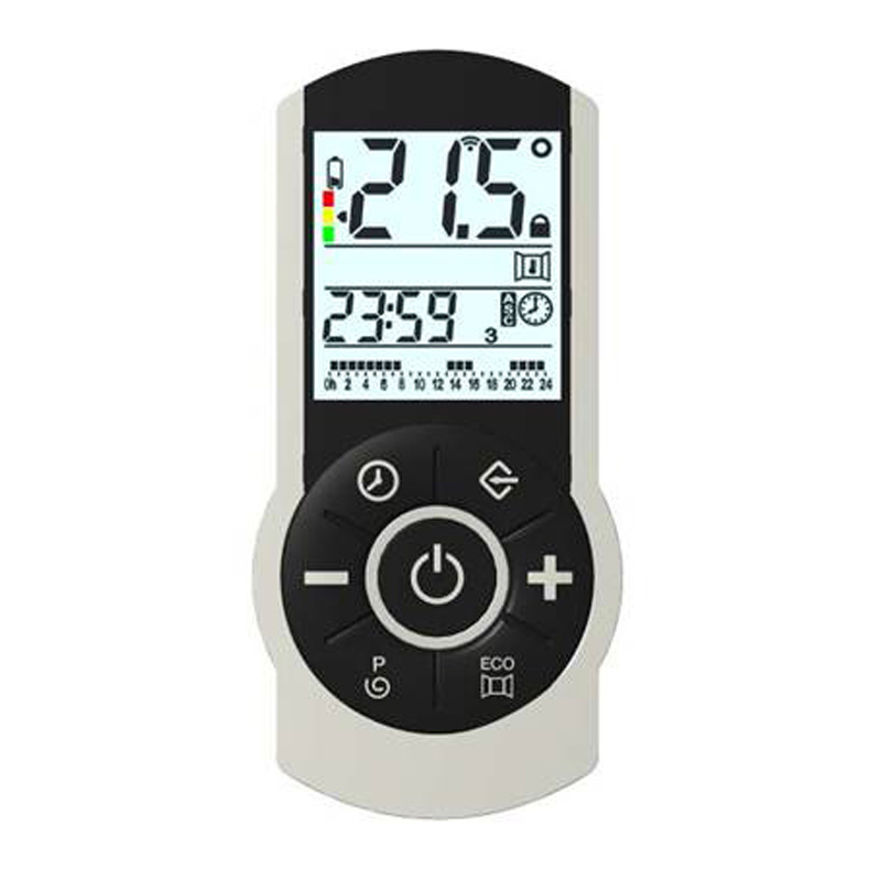 Este control remoto fácil de usar incluye un soporte de montaje en pared para mantenerlo seguro cuando no esté en uso y una pantalla LCD que muestra la hora actual y el modo de funcionamiento de su radiador.