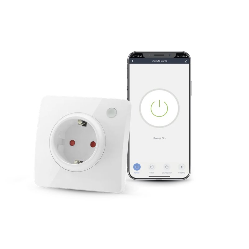 Garza Smarthome presenta este enchufe de pared wifi para dispositivos de hasta 3680W. Funciona por control remoto desde tu dispositivo móvil o tablet, a través de app gratuita de Garza Smarthome disponible para Android e iOS, y a través de asistentes de voz como Alexa y Google Home, también funciona con IFTTT.